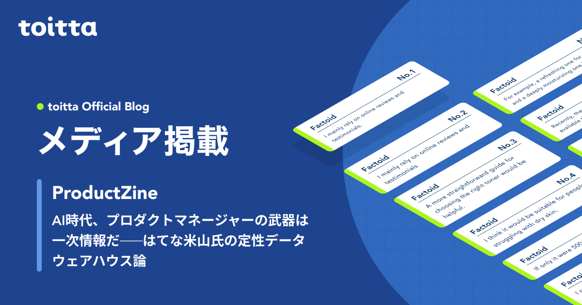 当ワークショップでは、「toitta」を利用して実際にKA法を用いた分析作業を体験いただきます。 ※2024年11月8日(金)開催のワークショップ(以下:前回ワークショップ)と同内容の企画です。前回ワークショップが応募多数につき早期に定員締切となったため、リクエスト開催の企画となります。前回ワークショップを受講された方のお申し込みはご遠慮ください。