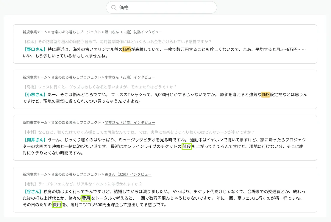 ユーザーインタビューのような自然な会話の場では、同じ意味の単語が異なる表現で登場したり、同義語・類義語で語られる場合があります。toittaの横断検索では、シンプルなキーワードマッチでは拾いきれない多様な表現を適切に拾い上げることができます。
