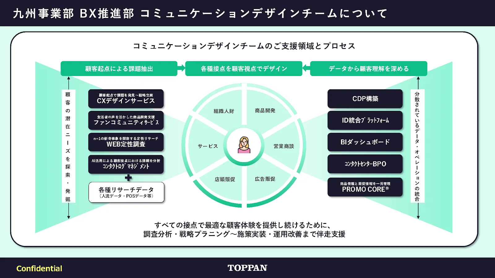 「生活者起点で心が動くビジネスを作る」をミッションに掲げる、TOPPAN株式会社‧九州事業部 BX推進部 コミュニケーションデザインチーム。企業や組織の課題を戦略立案から企画設計、制作実装とワンストップでサポートし、解決に導いています。本質的な課題解決のために、常に生活者の声と向き合い、ユーザーインタビューを核に据えてきましたが、手作業中心の従来フローは膨大な工数がボトルネックでした。そこで、分析工数削減のために導入されたのがtoitta。今回、チームリーダーの草刈さん、プランナーの山口さん‧神藤さんに、toittaを活用し生活者の声を提供価値へ結びつける取り組みの狙いと実践を伺います。